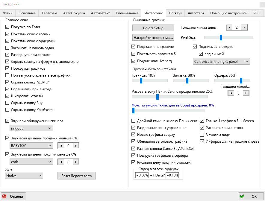 Интерфейс, общие настройки, графики, работа с ордерами, отчетом и логами